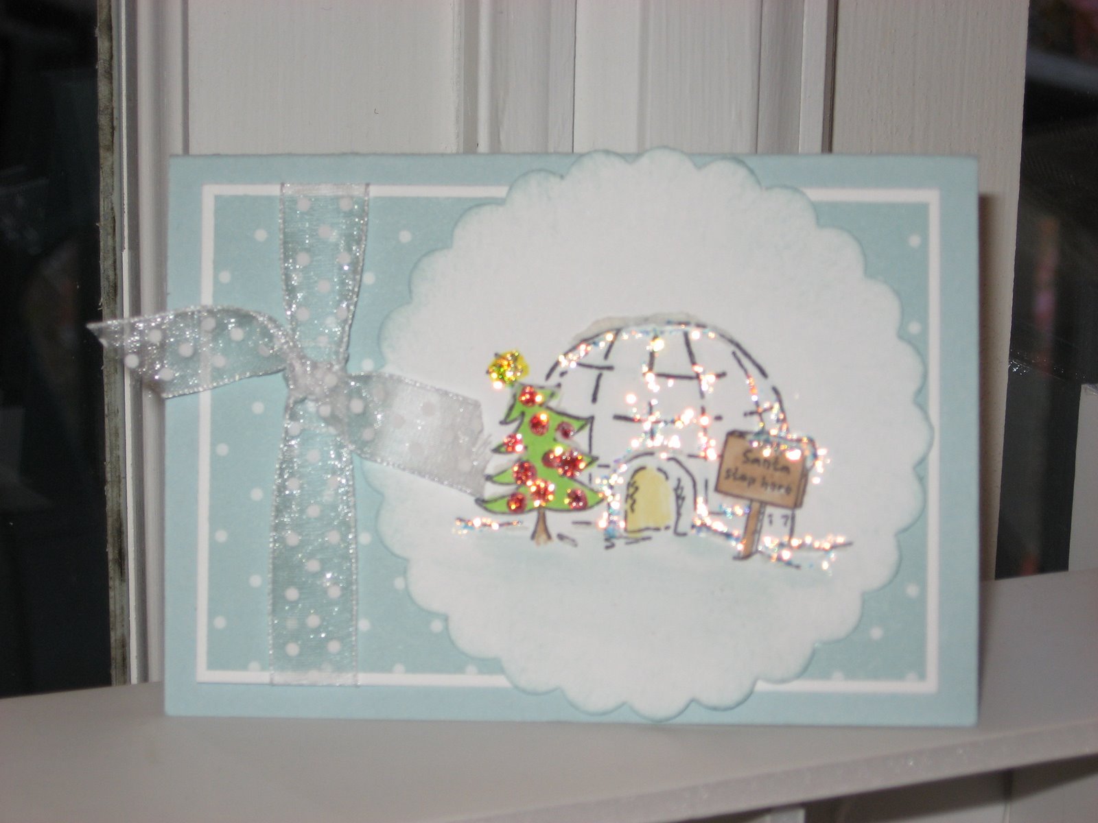 These Images were just screaming to be made into a winter shaker. I used kosher salt for snow and added some cute ribbon I got at the Target $1 spot. I added some green and red Stickles to the tree for a little shine and used my flannel and polka dot backgrounds. The Polka dot bkgd. is quickly becoming my favorite.